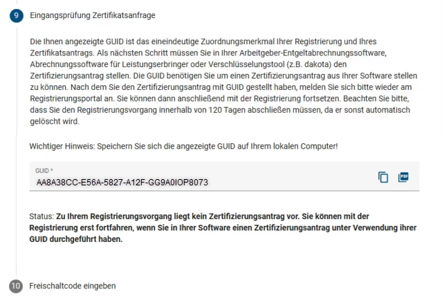 Zum Schluss erhalten Sie Ihre GUID, die Sie dann im SAP für die eindeutige Zuordnung zum neuen SV-Zertifikat benötigen.