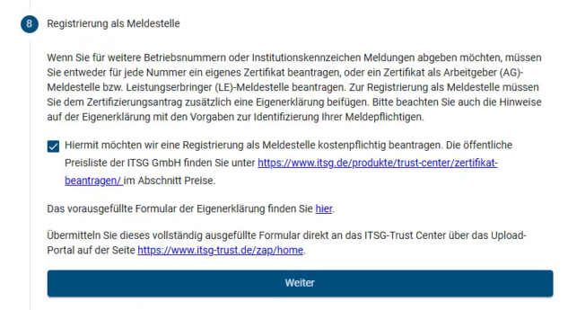 Sofern Sie in Ihrer Unternehmensgruppe oder Ihrem Konzern mehrere Firmen/Gesellschaften mit eigener Haupt-Betriebsnummer abrechnen, aber nur über eine einzige melden, müssen Sie in diesem Schritt ein Häkchen setzen. Damit beantragen Sie ein Zertifikat als Arbeitgeber-Meldestelle. In diesem Fall müssen Sie die Eigenerklärung herunterladen und im Uploadportal dem Antrag beifügen. Dazu kommen wir weiter unten im Beitrag.