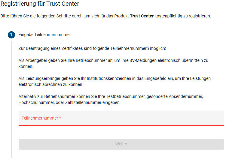 Erster Schritt ist die Identifizierung der Teilnehmernummer, für die das neue SV-Zertifikat beantragt werden soll. Geben Sie hierzu Ihre Betriebsnummer, mit der Sie derzeit Ihre SV-Meldungen versenden, ein.